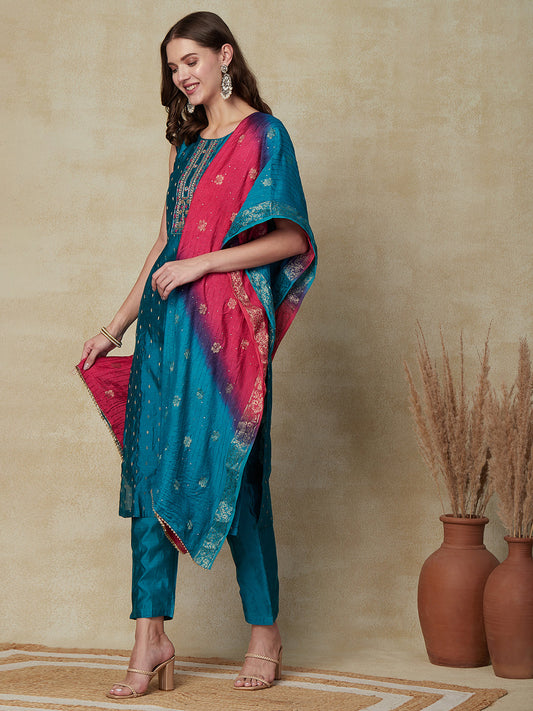 Ethnic Dobby & Embroidered Kurta with Pant & Ombre Dupatta - Turquoise Blue