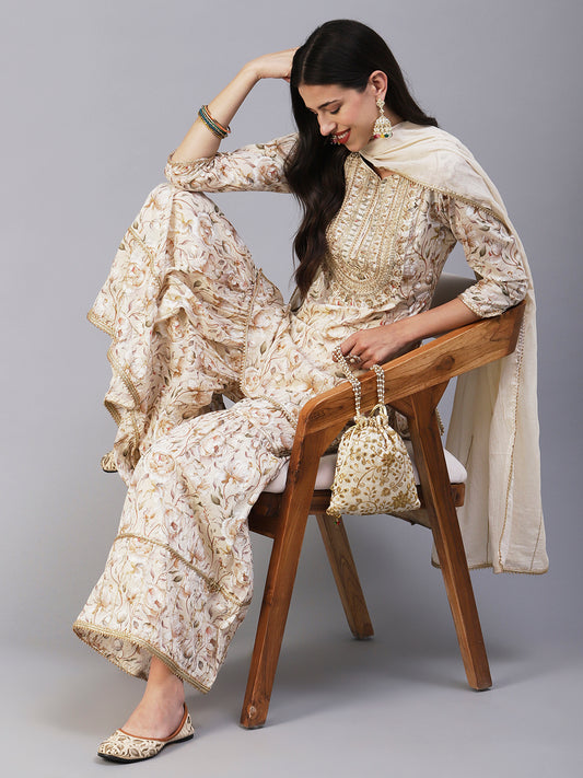 Floral Printed Zari & Resham Embroidered Short Kurta With Sharara & Dupatta - Cream