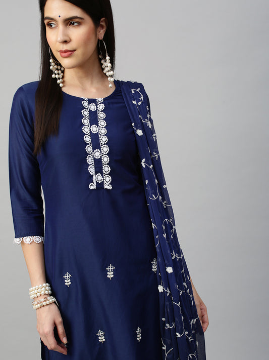 Floral Embroidered Kurta & Dupatta with Pant - Navy Blue