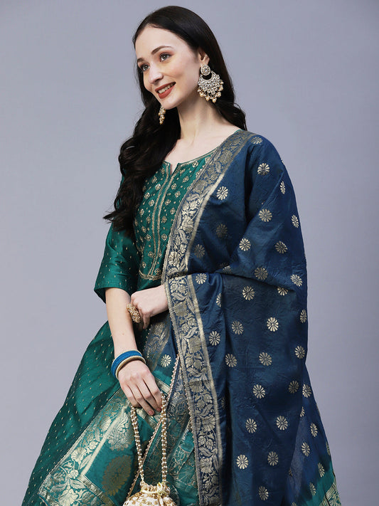 Solid Zari Jacquard Sequins & Zari Embroidered Kurta With Zari Jacquard Dupatta - Green