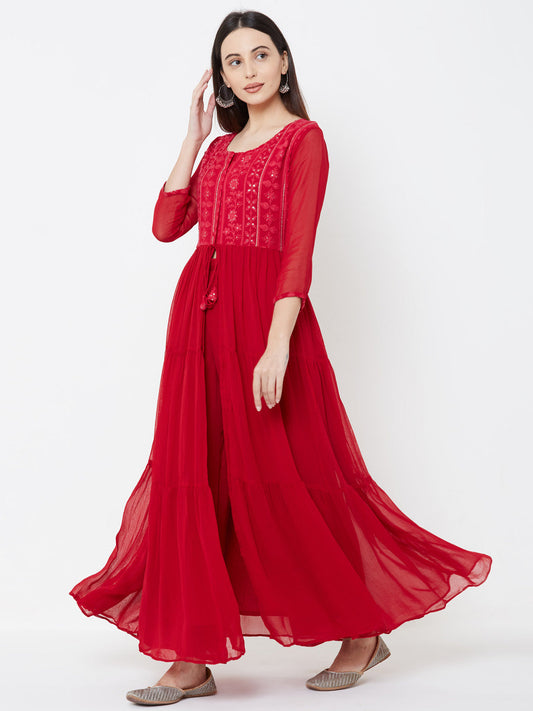 Floral embroidered Tiered Kurta with Solid Palazzo - Cherry Red