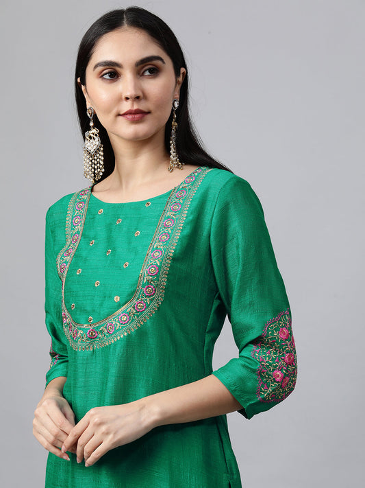 Floral Embroidered Kurta with Solid Pant with Bandhani Dupatta - Green