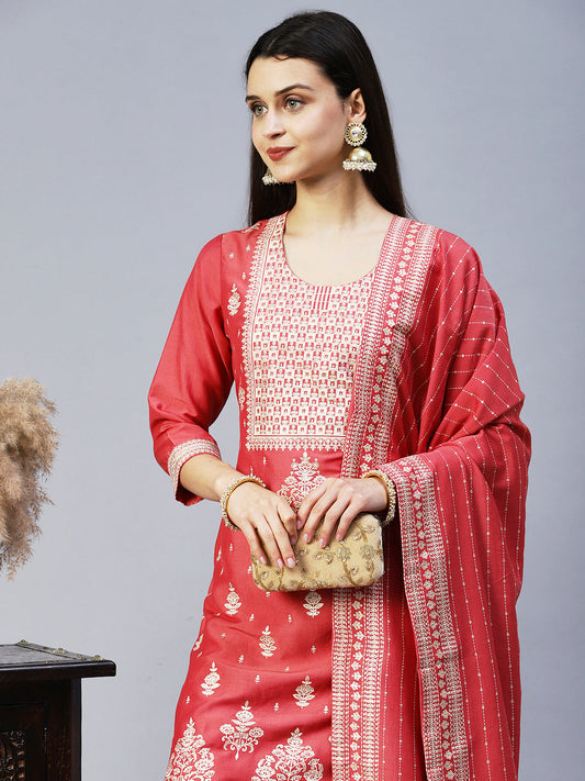Ethnic Woven Straight Kurta with Pants & Dupatta - Wine