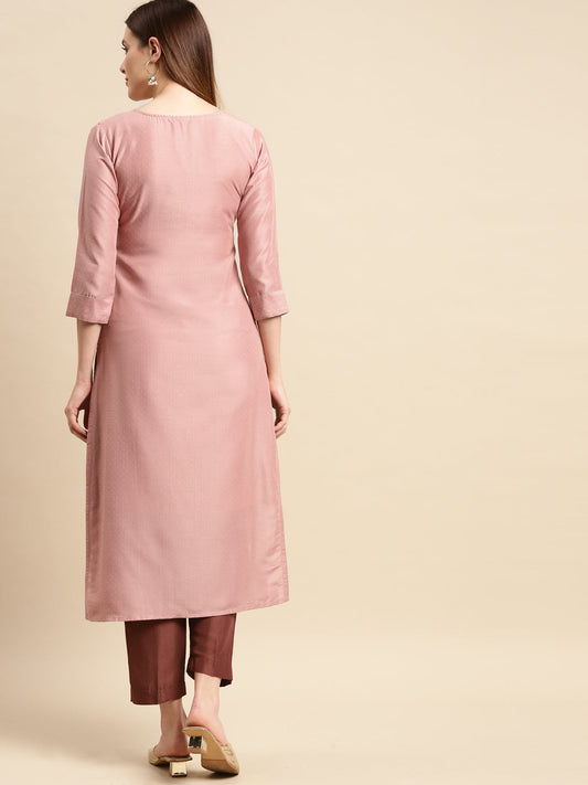 Ethnic Embroidered Kurta with Pant - Rose Pink