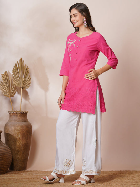 Solid Floral & Schiffli Embroidered Straight Fit Kurta - Pink
