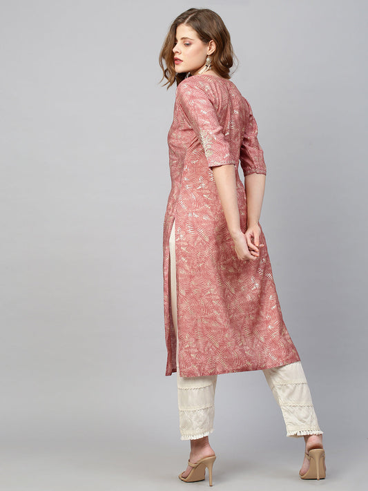 Floral Embroidered & Printed Straight Kurta - Hippie Pink