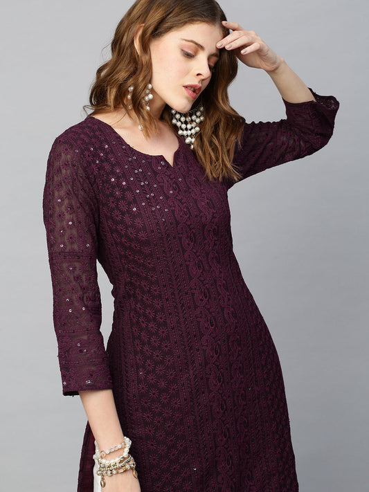 Chikankari Embroidered Straight Kurta - Deep Wine