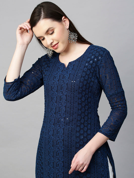 Chikankari Embroidered Straight Kurta - Dark Blue