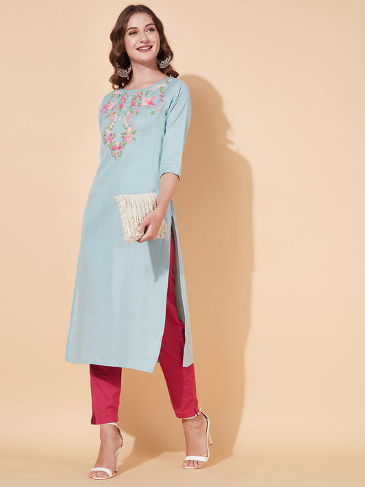 Floral Hand Embroidered Straight Fit Kurta - Powder Blue