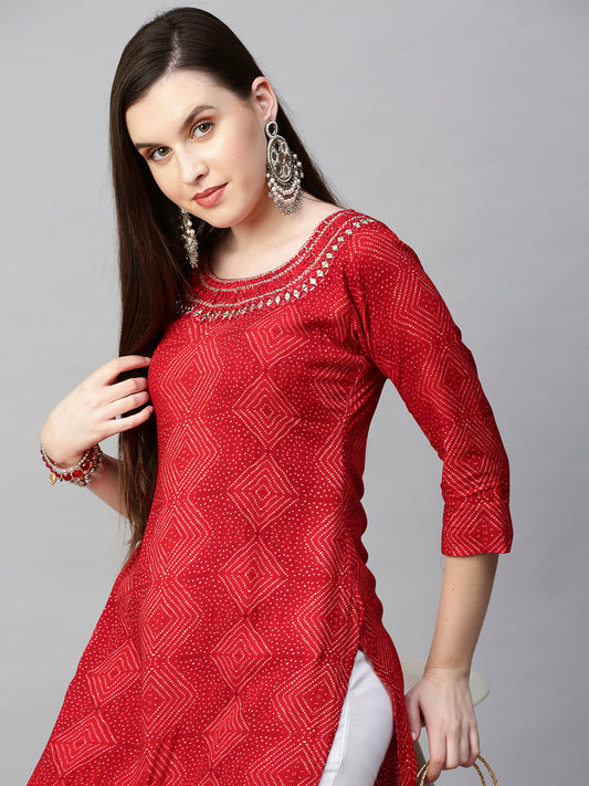 Bandhani Printed & Mirror Embroidered Straight Fit Kurta - Red