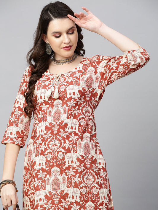 Ethnic Printed & Embroidered Straight Fit Kurta - Brick Red