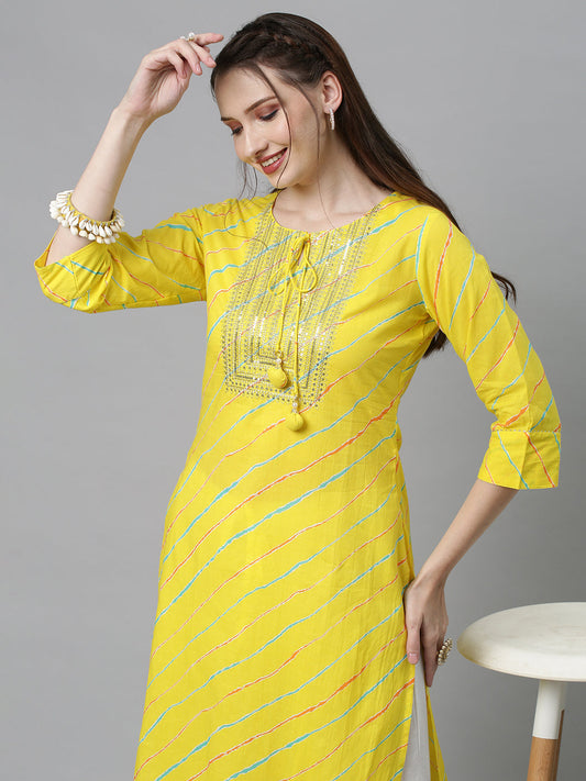 Leheriya Printed & Embroidered Straight Fit Kurta - Yellow