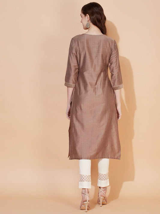 Ethnic Stripes Printed & Embroidered Straight Fit Kurta - Brown