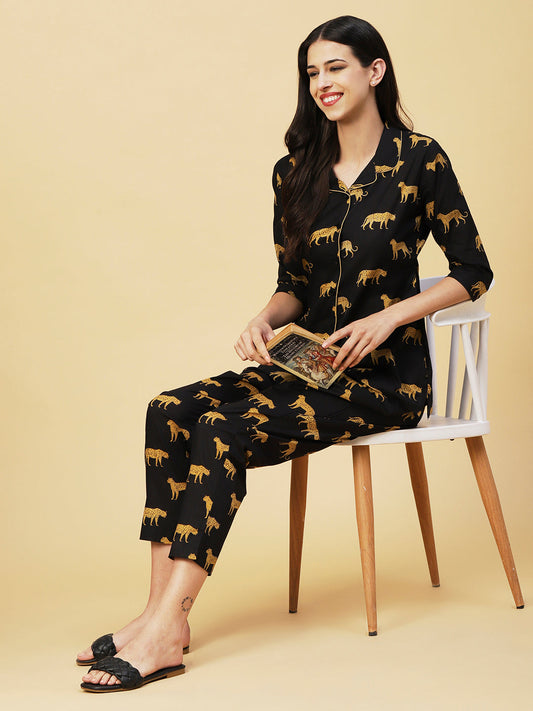 Animal Printed A-line Shirt With Pants Co-ord Set - Black