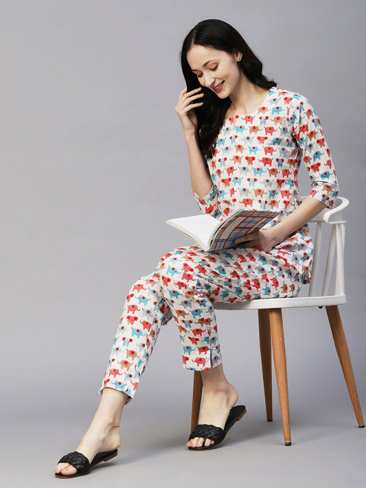 Elephant Printed Short Kurta With Pants Co-ord Set - White & Multi