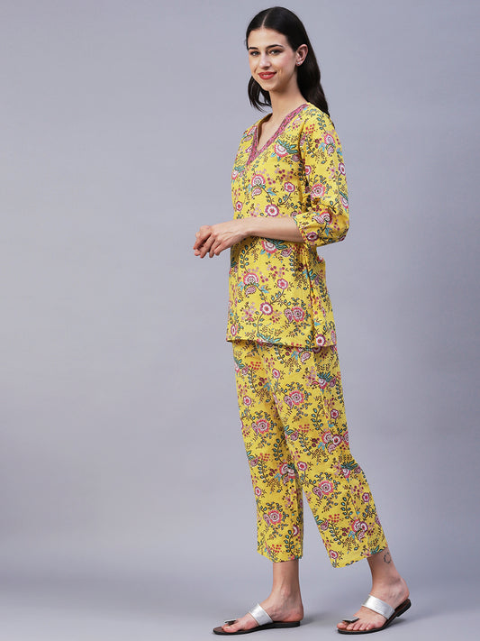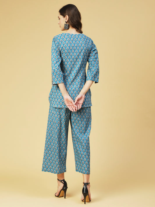 Ethnic Printed Lounge Wear Co-ord Set - Turquoise Blue