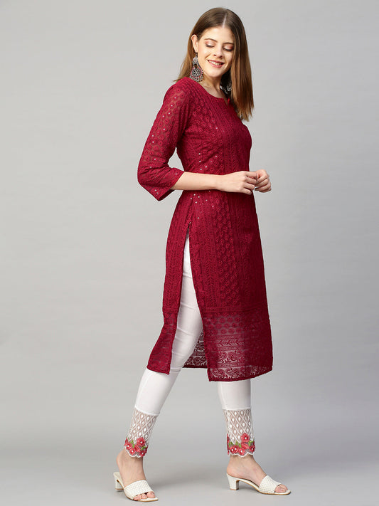 Ethnic Embroidered Straight Fit Kurta - Coral Pink