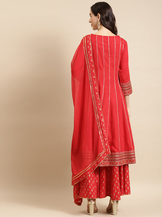 Embroidered Anarkali Kurta & Flared Palazzo with Dupatta - Red