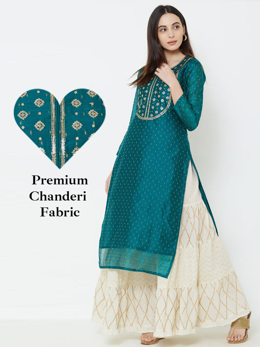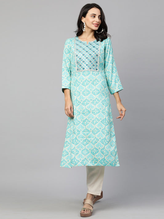 Embroidered & Printed Straight Kurta only - Cyan Blue