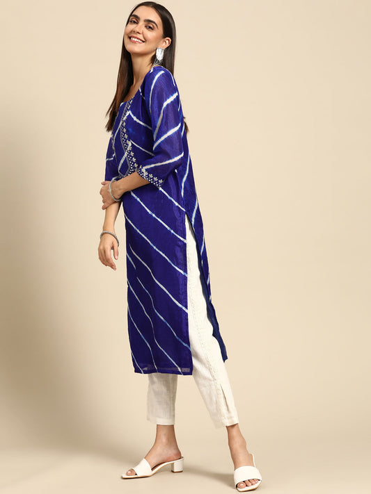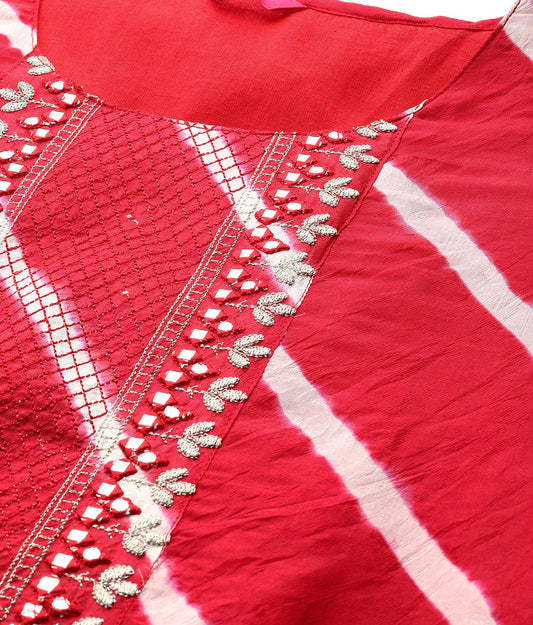 Leheriya Printed & Hand Embroidered Straight Fit Kurta - Hot Pink