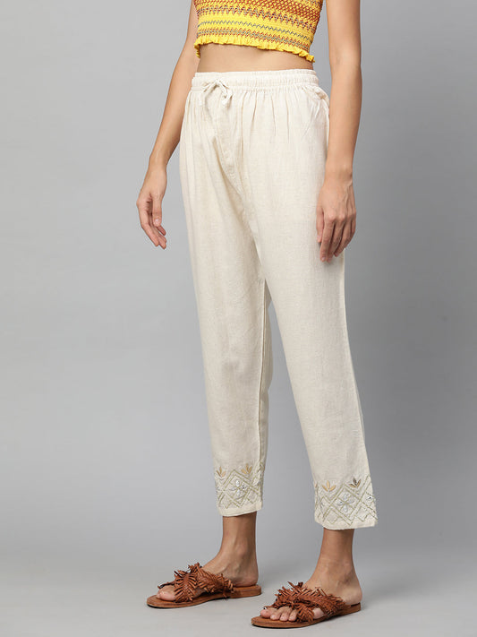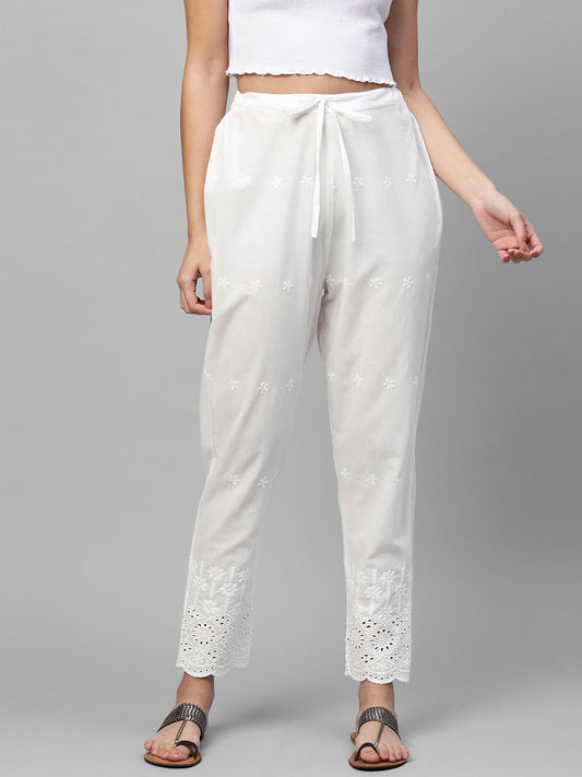 Solid Floral Embroidered Straight Fit Pant - White