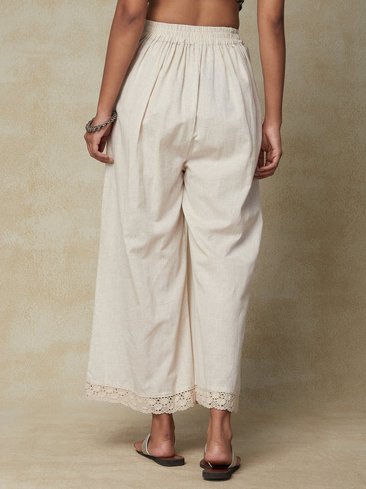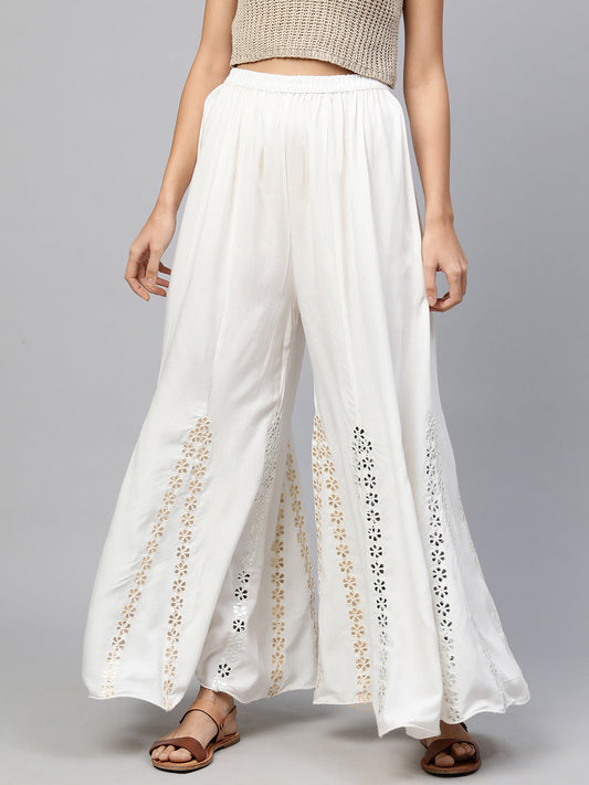Solid Schiffli Lace Detailed Straight Fit Palazzo - Cream