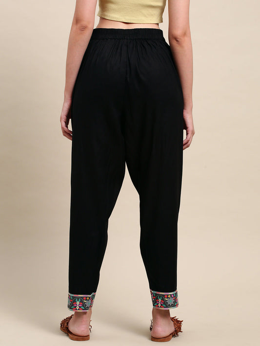 Solid Black Printed Border Ankle Pants - Black