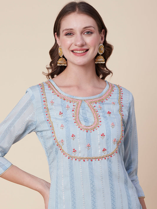 Woven Textured-Striped Zardozi Embroidered Kurta With Pants & Foil Printed Dupatta - Light Blue