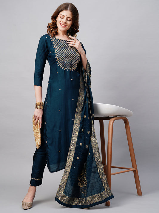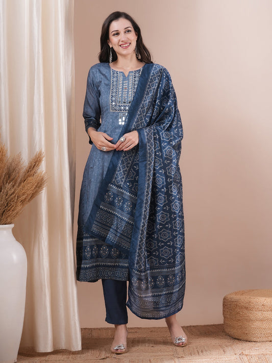 Ethnic Printed & Mirror Embroidered Straight Fit Kurta with Pant and Dupatta - Blue
