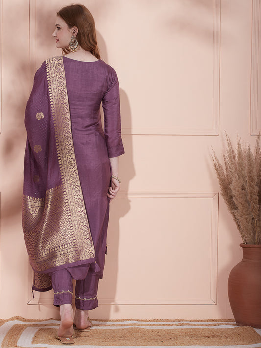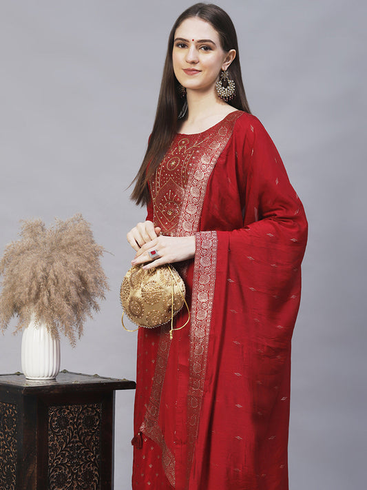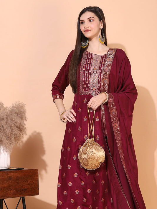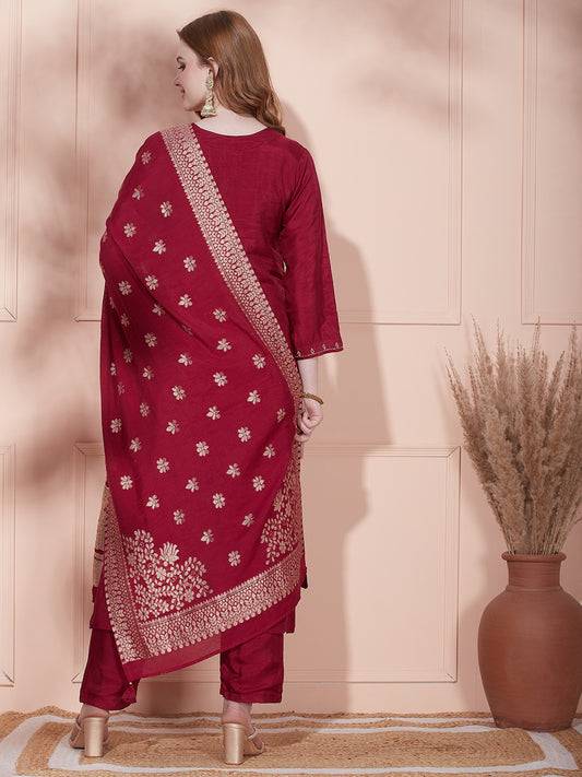 Ethnic Woven Straight Kurta with Pants & Dupatta - Wine