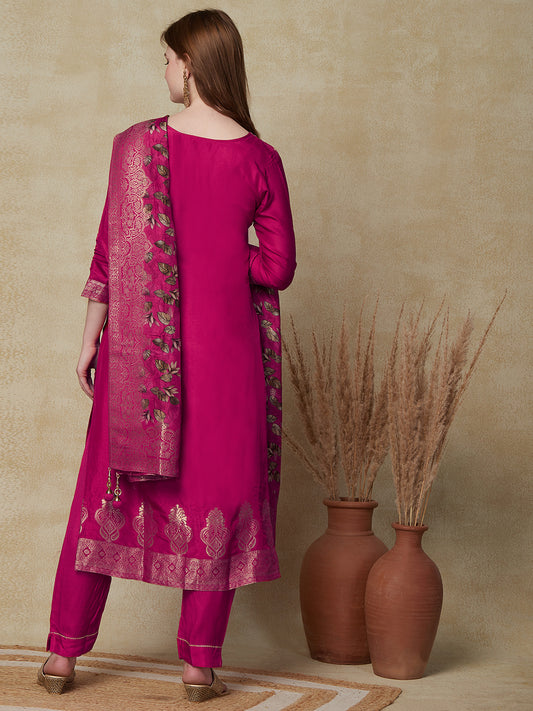 Zari Jacquard Design Kurta With Pant & Dupatta - Pink