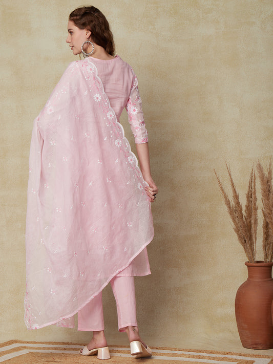 Floral Printed & Hand Embroidered Straight Fit Kurta with Pant & Dupatta - Pink
