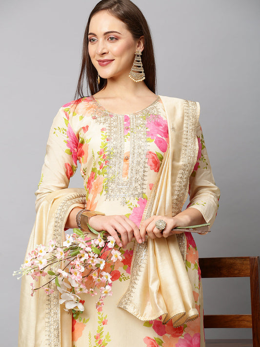 Floral Printed & Embroidered Kurta with Pants & Dupatta - Cream
