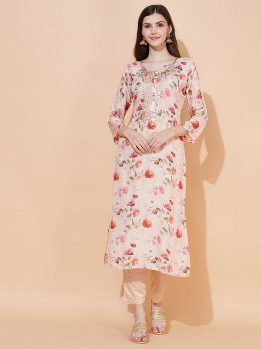 Floral Printed & Embroidered Kurta with Pants & Dupatta - Peach