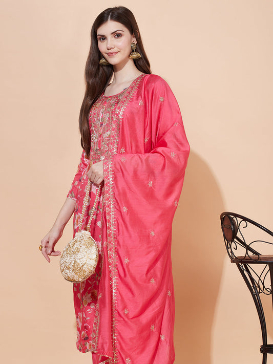 Floral Printed & Sequin Embroidered Straight Kurta with Pant & Dupatta - Pink