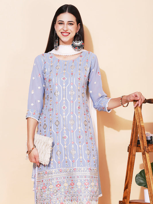 Ethnic Embroidered Straight Kurta with Pant & Dupatta - Powder Blue