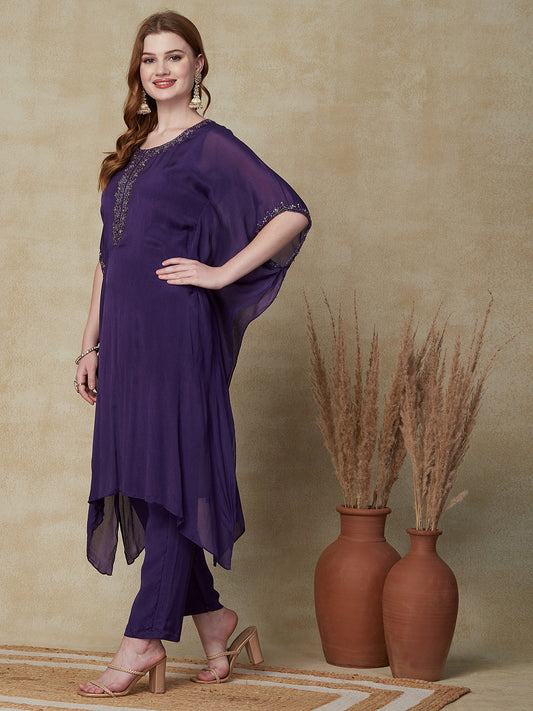 Solid Cutdana, Beads & Sequins Embroidered Kaftan With Pants - Purple