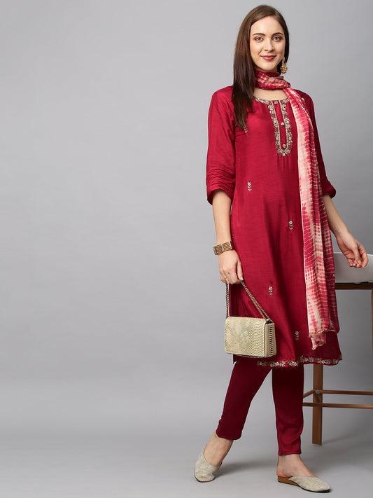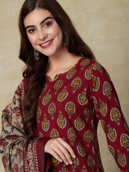 Ethnic Printed Cutdana & Sequins Embroidered Kurta With Pants & Dupatta - Maroon