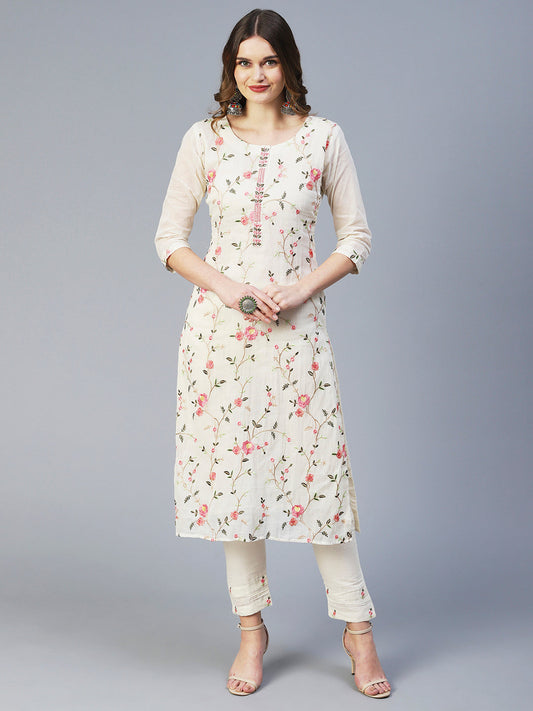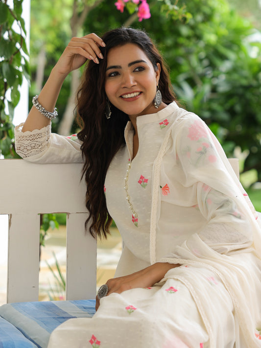 Solid Floral Embroidered Straight Fit Kurta with Pant & Dupatta - White