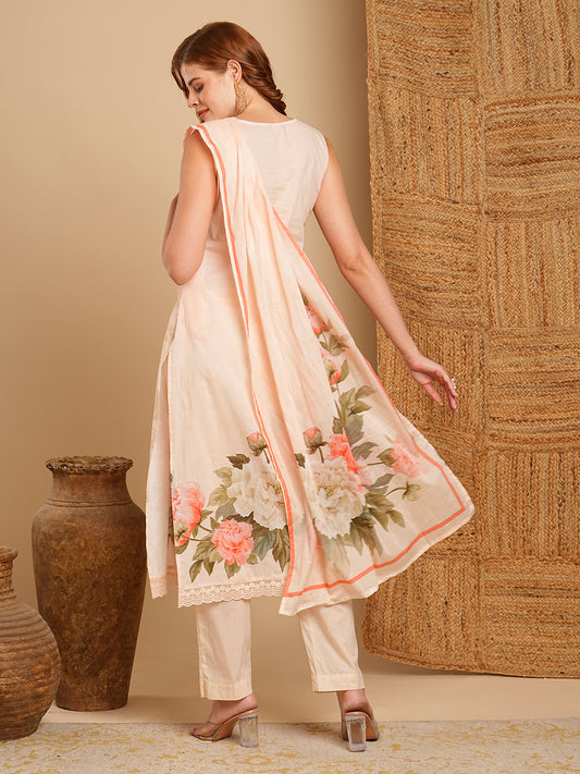 Floral Printed & Embroidered Kurta with Pant & Pure Cotton Dupatta - Peach