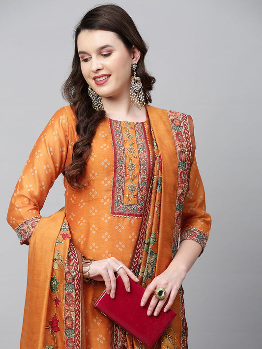 Bandhani Printed & Hand Embroidered Straight Kurta with Pants & Dupatta - Mustard