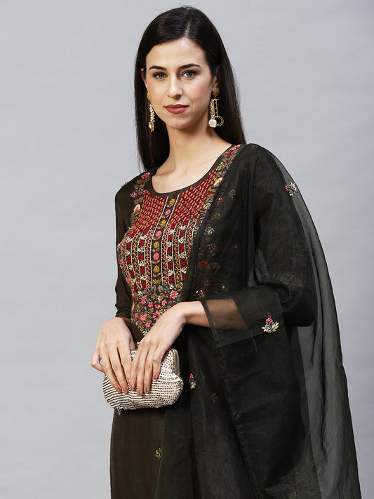Floral Hand Embroidered Straight Kurta with Pants & Dupatta - Dark Green