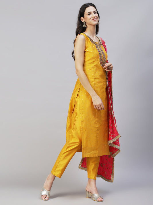 Floral Hand Embroidered Kurta with Pants & Dupatta - Yellow