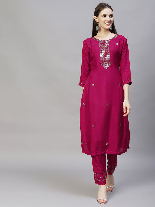 Ethnic Hand Embroidered Straight Kurta with Pants & Dupatta - Magenta Pink