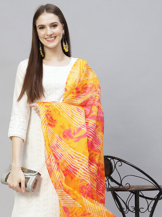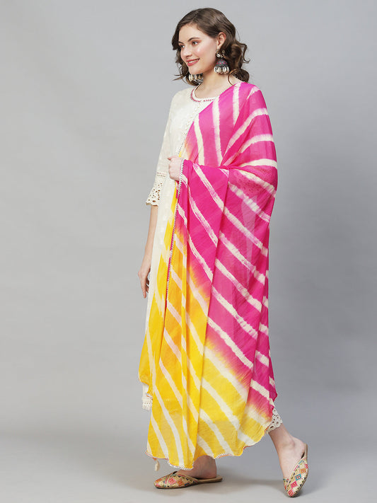 Lehriya Printed Mirror, & Zari Embroidered A-line Kurta with Pants & Shibori Dupatta - Yellow