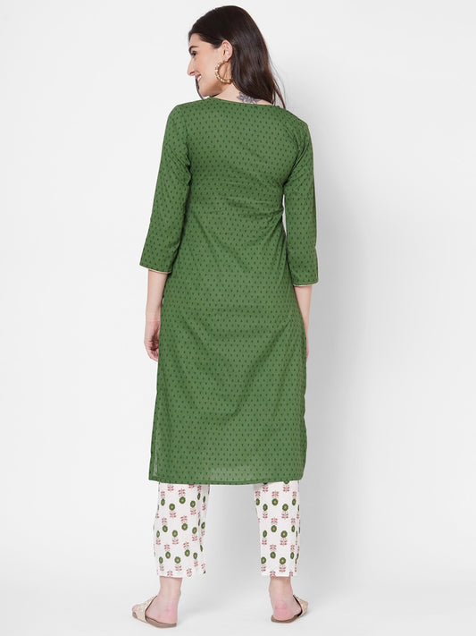 Ethnic Printed & Zari Embroidered Kurta With Block Printed Pant - Green