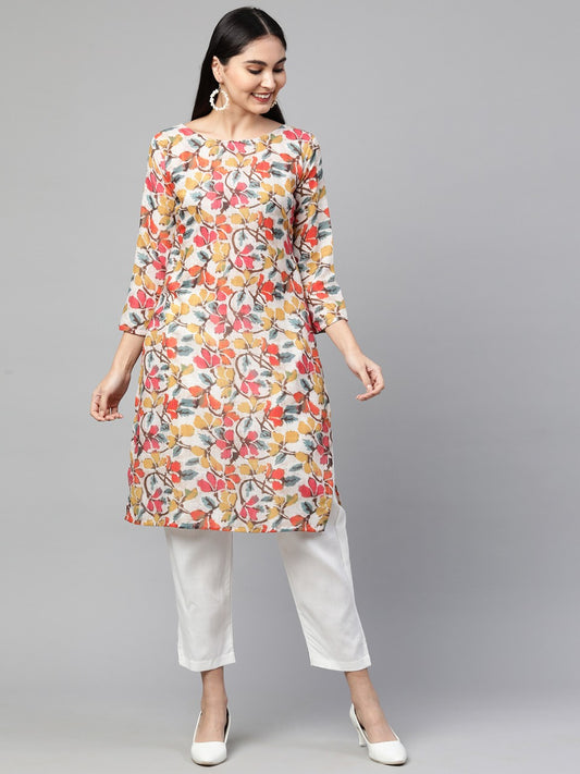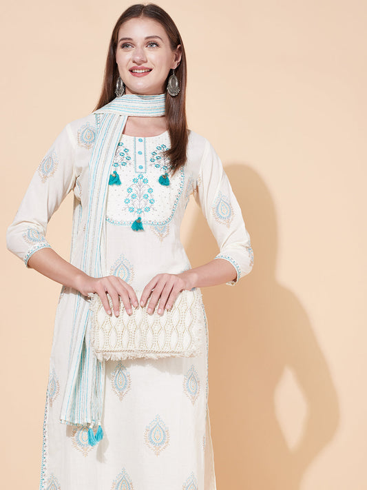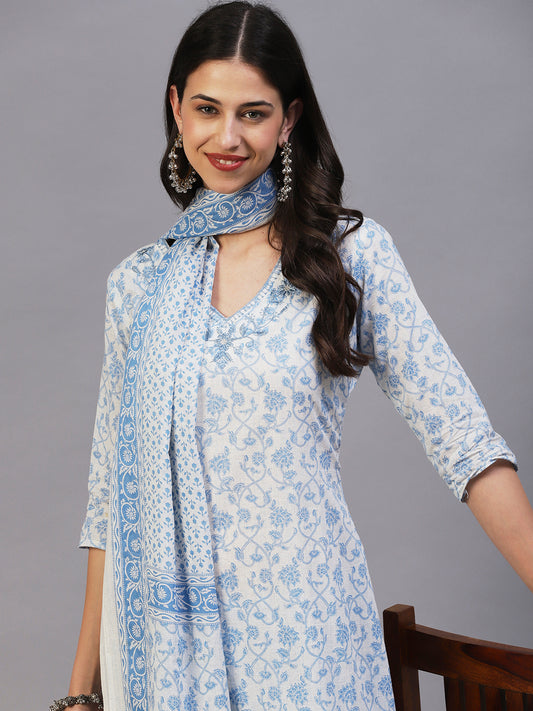 Ethnic Printed & Embroidered Kurta with Pants & Dupatta - Off White