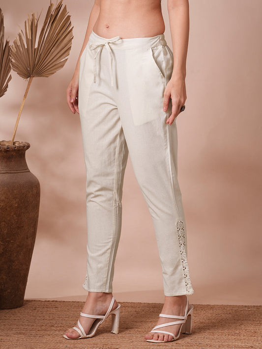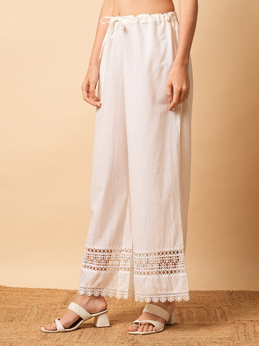 Solid Crochet Lace Patched Straight Fit Palazzo - White