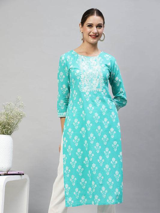 Floral Printed & Embroidered Straight Fit Kurta - Turquoise